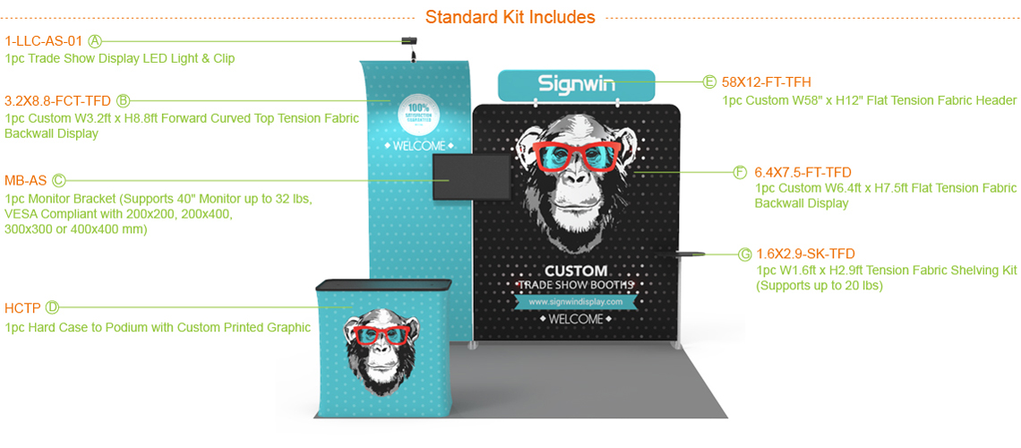 Multiple tension fabric backwall displays with superior quality fabric material can be custom printed with your business logo using heat transfer printing.The tension fabric backwall display is meticulously to match the background. This allows you to set up your own special trade show exhibits. The eye-catching structure is designed around a base aluminum frame and comes with a plastic case for easy dismantling and transportation. The whole backwall displays provide an elegant effect to your images, making it ideal for all your customized tradeshow booth ideas.