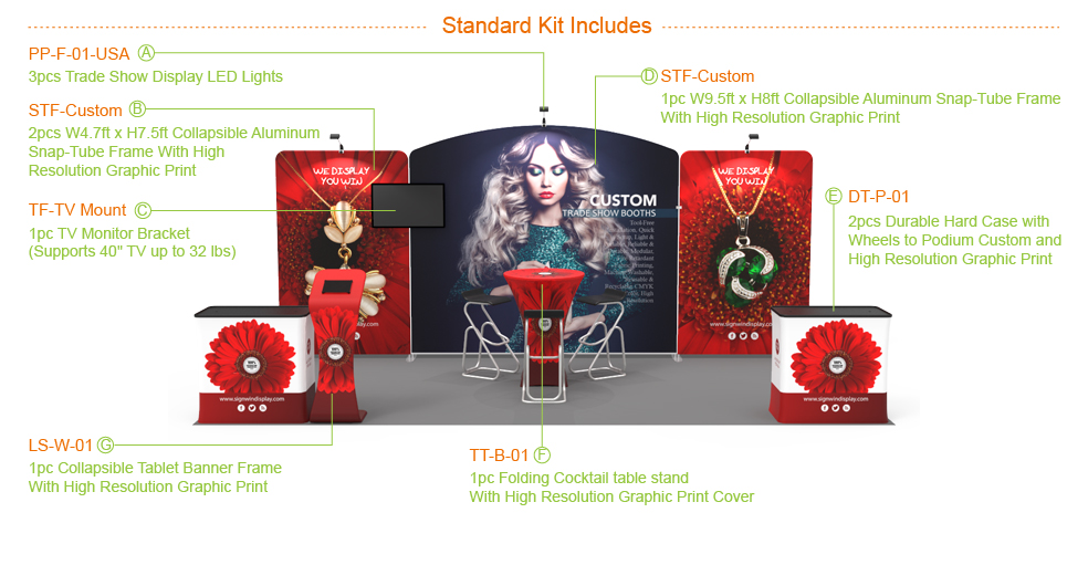 The tension fabric backdrop is so perfect for tradeshow, especially when there are media, so conspicuous that it may enhance your exposure. And you may divide the information you would like to present into three categories so that your audiences are able to seize the major points much more easily and rapidly. And a 40’’ monitor can be fitted into the adhered monitor bracket, which definitely captivates much more audiences to your booth. Moreover, the iPad banner stand helps your potential customers learn more about your products, you may also list a couple of Q&As on it, thus substantial time saved. Practically, the two cases are not only for beauty, but also used for products demonstration, data collection, freebies dispensing and components carrying while shipping. Last but not least, no events can be completed without mingling, that is why the cocktail table’s here, sparking conversations and holding drinks for the participants. No matter what kind of event, this booth set is ideal to check a major item off your list for the perfect showing.