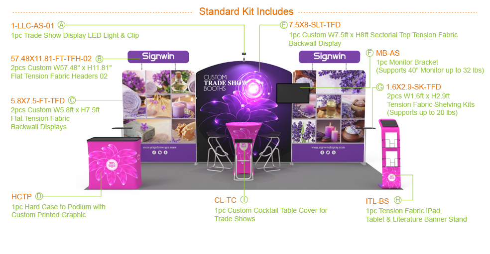 When your company spends the money, time, and effort to display a booth at a trade show, it is vital to make the best of it. Here comes the cost-effective, chic and comprehensive 10x20ft custom trade show booth 06, which you definitely would not like to miss. The gorgeous booth is comprised of: 1pc custom w7.5ft x h8ft sectorial top tension fabric backwall display with a LED light, 2pcs custom w5.8ft x h7.5ft flat tension fabric backwall displays with two flat headers, 1pc hard case to podium with custom printed graphic, 1pc tension fabric iPad, tablet & literature banner stand, 1pc custom cocktail table cover for trade shows and 1pc monitor bracket. Nobody can resist such a perfect kit.