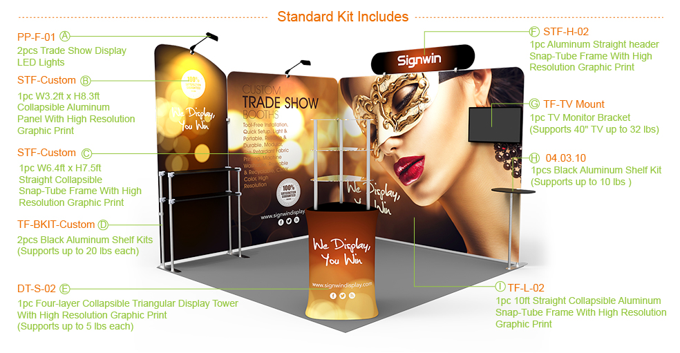 Customize a 10x10ft trade show booth combo for any events to grab attention, entices and engages audience and build your brand awareness at Signwin.