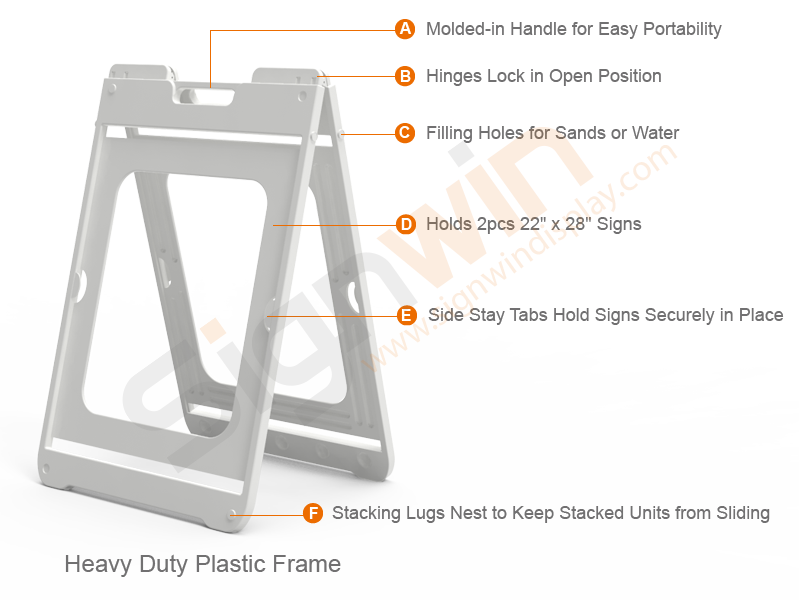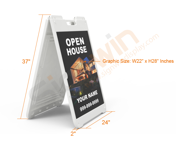 A-frame signs are also called sandwich board signs. You will often see advertisements at the entrances of bistros, restaurants, and coffee shops. It consists of a durable heavy-duty plastic frame and changeable coroplast graphic with UV printing. Hinges lock in the open position, molded-in handle for easy portability, stacking lugs nest to keep stacked units from sliding, holds 2pcs 24"x36" signs, filling holes for sands or water. Side stay tabs hold signs securely in place. It can be reused and can be installed well in the back of the car. Whether in the countryside, in the grass, or in the concrete jungle, it can be easily set up on the sidewalk or lawn to advertise the upcoming houses. The use of standard a frame sign holders open house is very suitable for increasing traffic and expanding the audience market. Let potential buyers understand the open day activities. Guide event participants from the highway to crossing the road and directly into your open property.