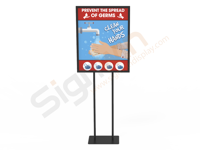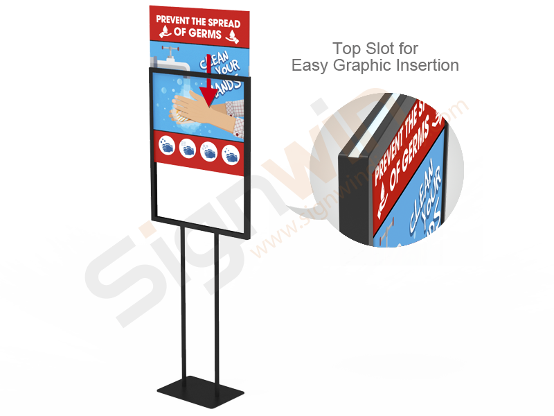 Rigid matte black frame is designed for heavy outdoor and indoor strength rigid signage applications, impact resistant, and able to withstand harsh environments. It is recommended for 22" x 28" signage permanent applications. The poster rack includes a black rectangular base, 1/8" thick double-sided PVC graphic printing, and the top card slot design facilitates quick loading of the screen. These materials provide the best durability and longevity. Signwin provides design services or you can upload your screen templates to meet graphic printing needs. The high quality, cheap, and quick turnover of the poster stand make it be one of the best-selling products. Signwin’s anti-epidemic security poster stand is your best visual cue solution for washing your hands and preventing the spread of bacteria. In addition, if you want to increase revenue, you must display poster that promotes new services, products, seasonal promotions, special events, or any other promotional activities. Another way to increase the effectiveness of advertising is to follow a consistent design and planning. Our deals promotional & “We’re Open” poster stands can expand your marketing scope. Let us have a large number of choices to help point the way!